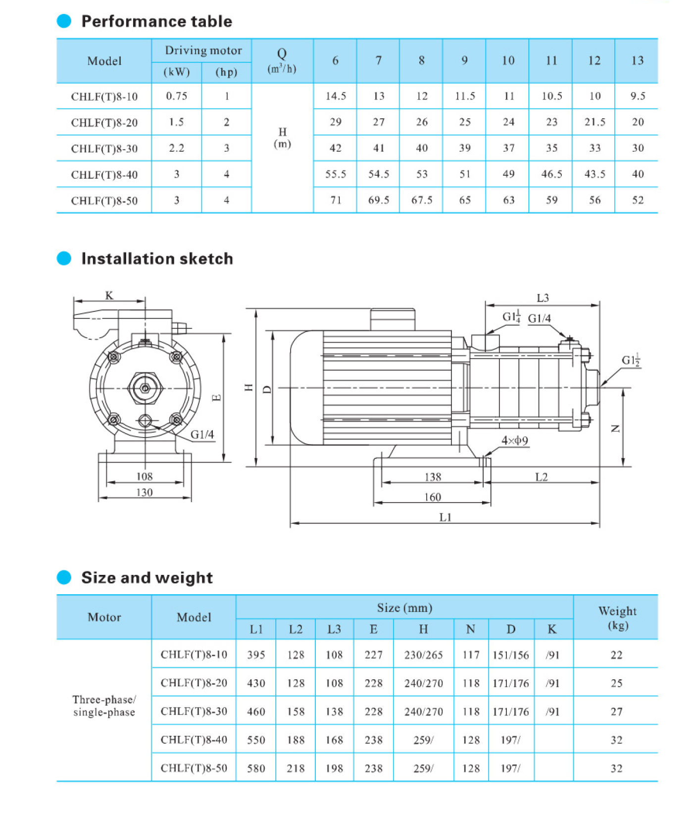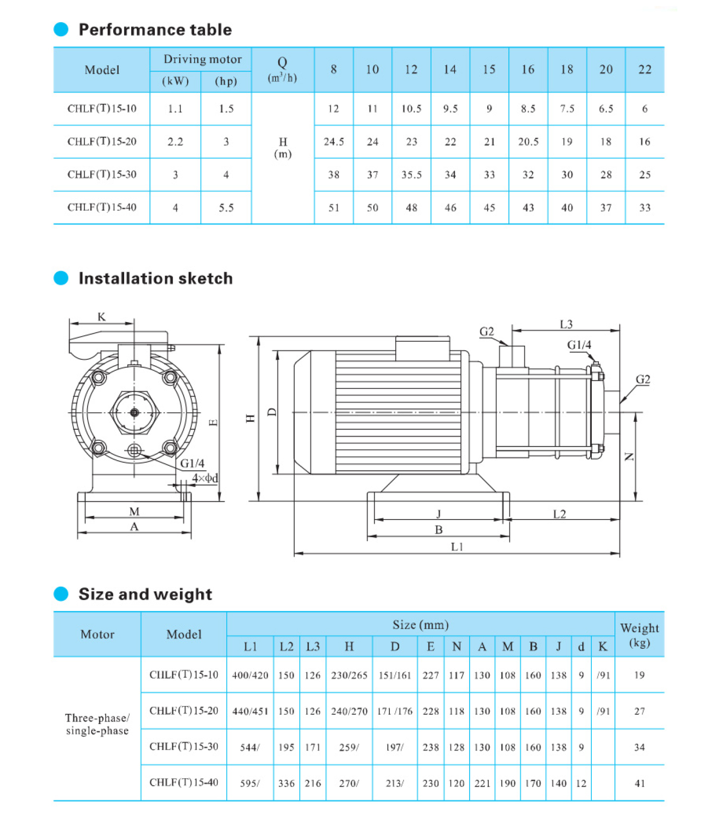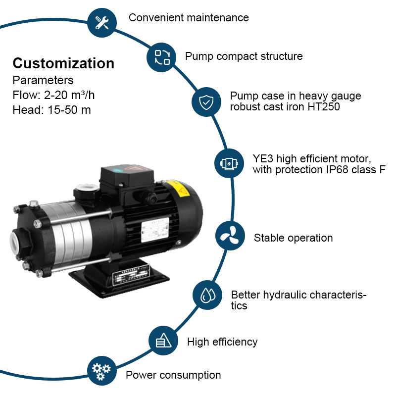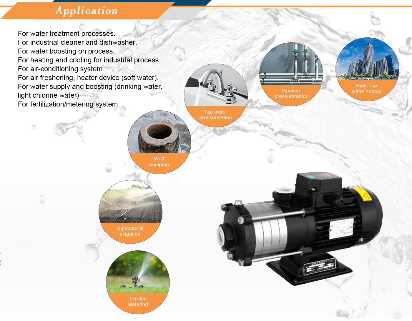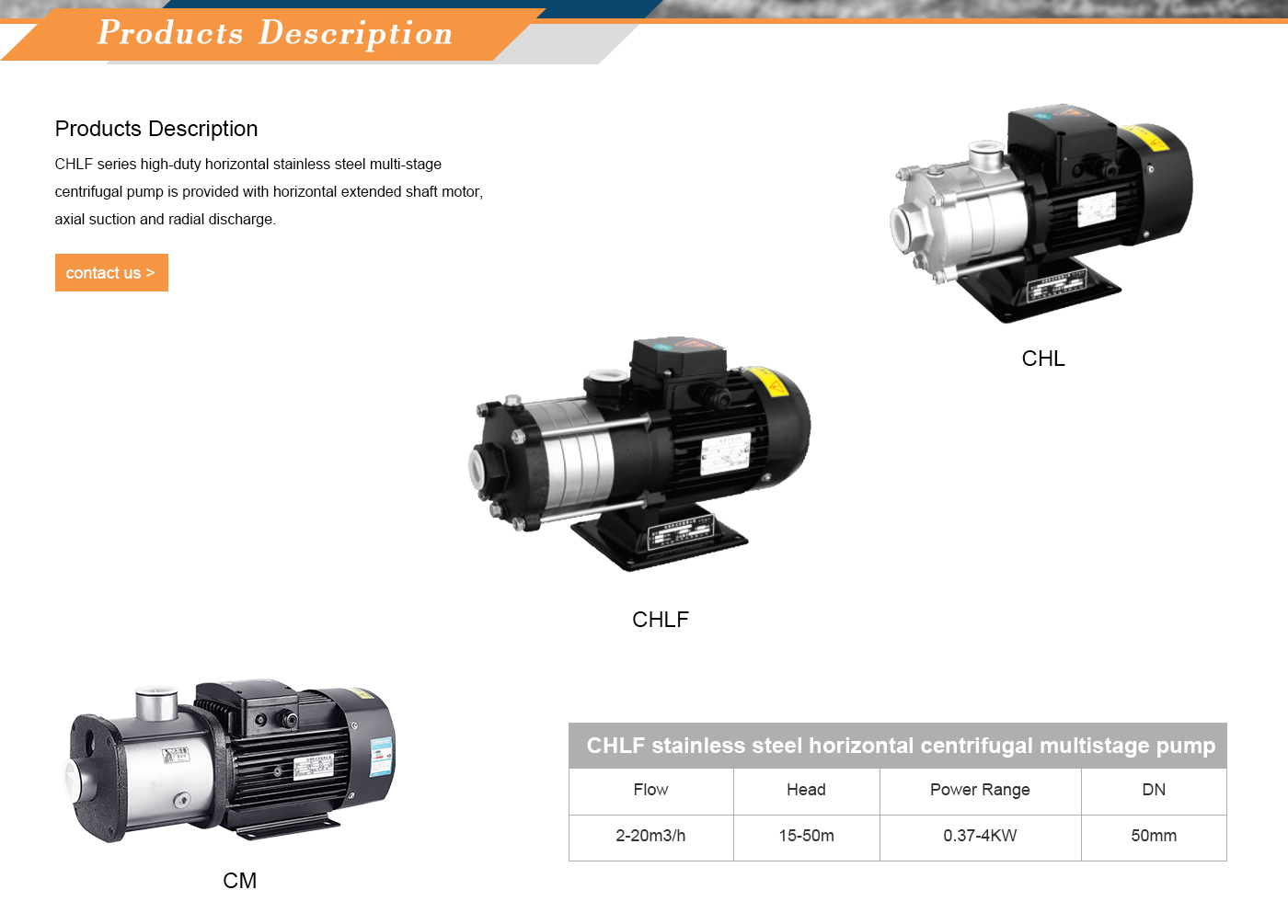 پمپ گریز از مرکز چند مرحله ای از جنس استنلس استیل افقی سری CHLF با موتور شفت افقی افقی، مکش محوری و تخلیه شعاعی ارائه می شود.